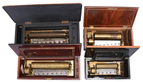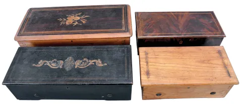 Music Boxes- 4 (Four) Swiss Music Boxes: (1) 6 inch cylinder on a comb with approximately 84 teeth; (2) 8 inch cylinder played on a comb with approximately 118 teeth; (3) 11 inch cylinder on a comb with approximately 108 teeth; (4) 11 inch cylinder with
