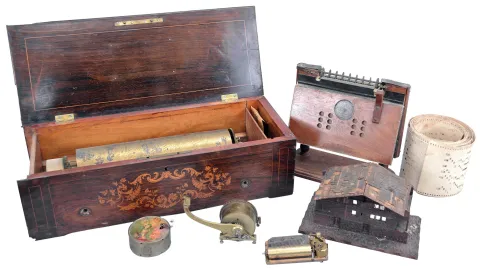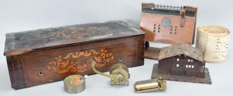 Music Boxes- 4 (Four) Swiss Music Boxes: (1) 6 inch cylinder on a comb with approximately 84 teeth; (2) 8 inch cylinder played on a comb with approximately 118 teeth; (3) 11 inch cylinder on a comb with approximately 108 teeth; (4) 11 inch cylinder with approximately 60 tooth comb; (5) 13 inch cylinder on a comb with approximately 122 teeth with inlayed case. Lot also includes some small music box related parts. mostly complete, but all in need of restoration. Rust on steel parts and some case parts missing. Three of the music boxes have broken comb teeth. Dimensions are for largest music box. Sold "as is".