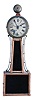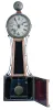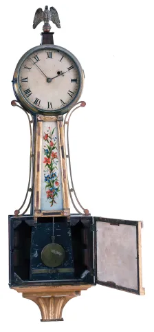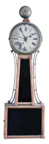 (1) Refinished mahogany and gilt frame case has loss to the gilding and spotty gold painted to cover defects. One of the rope moldings is missing on the bottom door left side. Tablets are not original. Original sheet metal dial has scattered paint loss. Dial is attached to the head with three L-turns. One of the sidearms has a couple diamonds missing and a repair. Brass movement based on a design by A. Willard, Jr., is attached to the case with through bolts. Original bell and mounting stand. Original hour and minute hands. Alarm setting hand is brass, but maybe original. The lever on the movement front plate to activate the alarm is missing; (2) Mahogany and gilt frame case has loss to the gilding on the throat frame and the bottom bracket. Both tablets are replaced. Original dial looks to have had the numbers relined. Period hands. The bezel has been shifted from its original position.