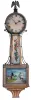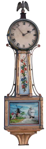 Clocks- 2 (Two): (1) Massachusetts, 8 day, time and alarm weight brass movement Patent or banjo timepiece with alarm on top bell in gilt front case, c1825; (2) Massachusetts, 8 day, weight brass movement Patent or banjo timepiece in gilt front case, c1825