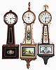 Clocks- 3 (Three): (1) Massachusetts, 8 day, weight brass movement patent or banjo timepiece. This timepiece may have been made by Horace Tifft, North Attleboro based on the bottom door latch, c1840; (2) Waltham Watch Co., Waltham, Mass., 8 day, weight