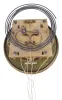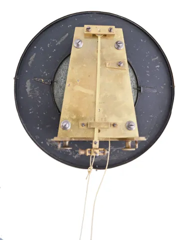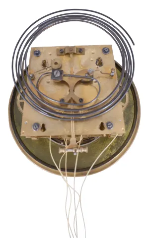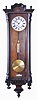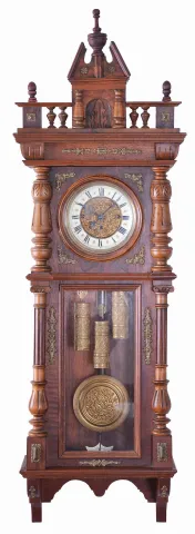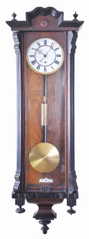Clocks- 2 (Two) Gustav Becker Vienna Regulators: (1) Gustav Becker, Freiburg, Germany, one weight, 8 day Vienna regulator in a walnut veneer case with ebonized accents, white enamel dial with Roman numerals; (2) Gustav Becker, Freiburg, Germany, 3 weight quarter-striking, 8 day Vienna regulator in a walnut case with cast gilt metal ornaments, polychrome porcelain dial with embossed center, matching embossed brass weights and brass pendulum. (1) veneer losses. Broken and repaired lower finial. Case has its original finish with losses to ebonized areas. Dial has hairlines in two areas. Hands appear original. Some browning of the lacquer on the brass pendulum bob and weight. Glasses are in good condition. Movement serial number 49465; (2) Crest was broken and the repair has failed. Dial and hands are fine. Beat scale has a few hairlines. Movement serial number 181913 with Medaille D'Or stamp. Dimensions are for 3 weight clock.