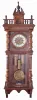 (1) veneer losses. Broken and repaired lower finial. Case has its original finish with losses to ebonized areas. Dial has hairlines in two areas. Hands appear original. Some browning of the lacquer on the brass pendulum bob and weight. Glasses are in good condition. Movement serial number 49465; (2) Crest was broken and the repair has failed. Dial and hands are fine. Beat scale has a few hairlines. Movement serial number 181913 with Medaille D'Or stamp. Dimensions are for 3 weight clock.