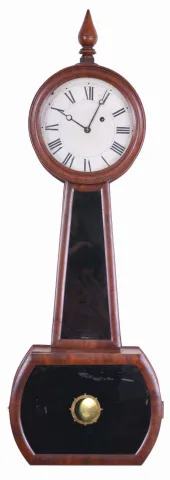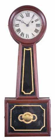 Clocks- 3 (Three) American Banjo Wall Clocks: (1) Unknown, possibly an Attleboro patent or Banjo clock or timepiece, 8 day, weight driven brass movement in a plain walnut case with painted metal dial; (2) Attributed to Horace Tifft, North Attleboro, Mass. Patent or Banjo timepiece, 8 day, weight driven, brass movement with painted metal dial in a mahogany case. (3) Daniel Pratt & Sons, Reading, Mass., Banjo timepiece, 8 day, weight driven brass movement. all have some paint loses on dials, tarnished brass bezels, small case repairs, touched up glasses or with losses. Sold "as is".
