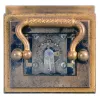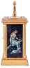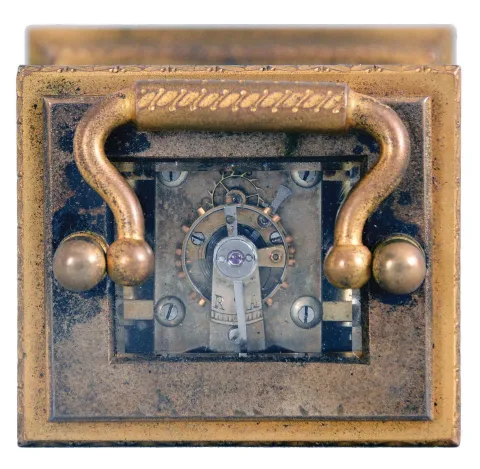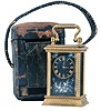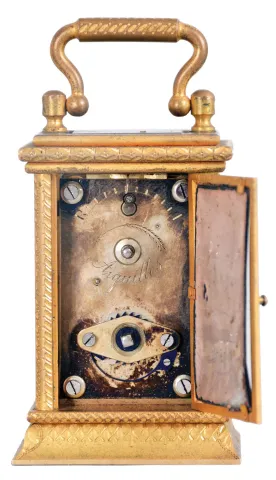gilding dirty and with wear, front glass with chips, left panel with cracks and losses, right side panel missing, rear panel cracked, dial with chip at upper right movement dirty, running, travel case with losses, travel case dimensions listed