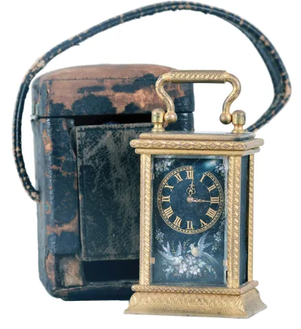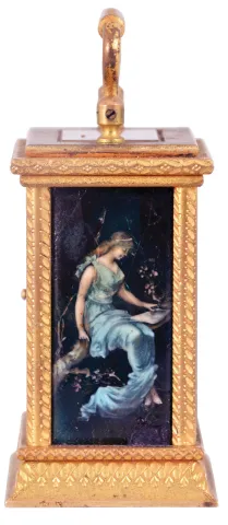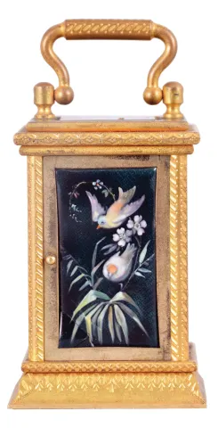 France, a miniature carriage timepiece with enamel panels and travel case, gilt case with carrying handle, the sides and back with polychrome enamel decorated copper panels, the dial with teal blue enamel ground, and decorated with polychrome birds and foliage, gilt Roman numeral chapter ring with fancy gilt hands, 8 day timepiece movement with lever platform, with original leather covered wooden travel case gilding dirty and with wear, front glass with chips, left panel with cracks and losses, right side panel missing, rear panel cracked, dial with chip at upper right movement dirty, running, travel case with losses, travel case dimensions listed