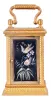 France, a miniature carriage timepiece with enamel panels and travel case, gilt case with carrying handle, the sides and back with polychrome enamel decorated copper panels, the dial with teal blue enamel ground, and decorated with polychrome birds and