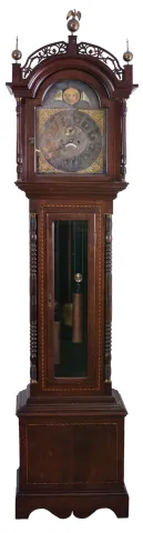 Ty Burtt, England, tall case clock, 8 days, time and gong strike, brass weight driven movement in an inlaid cherry case with with fret work hood, brass finials including eagle center, full turned columns flanking hood, beveled glass trunk door flanked by full columns and applied bracket base. The brass dial has silvered chapter ring, applied brass numerals, moon phase and date calendar the case retains its original finish. Several pieces of the fretwork are absent. The moon phase is flaking and has touch up. The lower right return molding on hood has a six inch piece absent. The left trunk molding and column are a little loose. The silvered chapter ring is tarnished and begs to be resilvered. There are other nicks and scrapes, otherwise a good looking example.