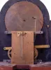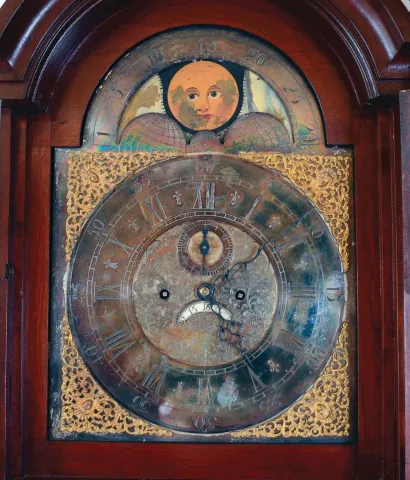 the case retains its original finish. Several pieces of the fretwork are absent. The moon phase is flaking and has touch up. The lower right return molding on hood has a six inch piece absent. The left trunk molding and column are a little loose. The silvered chapter ring is tarnished and begs to be resilvered. There are other nicks and scrapes, otherwise a good looking example.