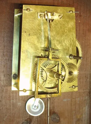 Unknown, probably a Massachusetts made 8 day, weight brass movement wall timepiece.