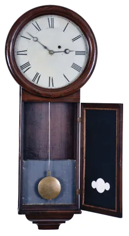 A cherry case that has some of its grain painting intact has some dings and scratches and a small damaged area on the bottom bracket. Original painted dial has some loss at the mounting screws and the winding arbor. Original hour hand. Minute hand is a possible replacement as it is a little too short. Weight baffle has been replaced. The tablet has been restored.