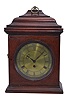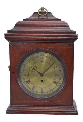 European (Continental), small bracket clock, late 18th century, with fusee / crown wheel / pivoted pendulum movement, and engraved brass dial, in a primitive bell top case of English appearance, with slide-up back and with restorations. Approx 3 day duration (6 rounded channels in fusee) . gut is worn and needs replacing, but was strong enough for a little wind and to show that the movement is running. Movement is held to a seat board via screws through bottom pillars, and that board is held in case with a single wood screw at bottom. Although case is quite old, it is probably not the original for this movement. Well engraved brass dial needs silvering. Object left side molding needs re-gluing. Still an attractive adaptation of a well made movement that will appeal to those attracted to mechanics. Movement plates measure 3 x 3.5in.