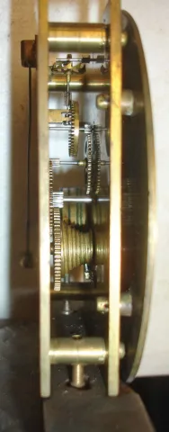 gut is worn and needs replacing, but was strong enough for a little wind and to show that the movement is running. Movement is held to a seat board via screws through bottom pillars, and that board is held in case with a single wood screw at bottom. Although case is quite old, it is probably not the original for this movement. Well engraved brass dial needs silvering. Object left side molding needs re-gluing. Still an attractive adaptation of a well made movement that will appeal to those attracted to mechanics. Movement plates measure 3 x 3.5in.