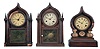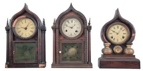 Clocks- 3 (Three): (1) Brewster & Ingrahams, Bristol, Conn., "Round Gothic" shelf clock now fitted with a Seth Thomas spring driven, 8 day, time and strike movement in a mahogany veneered case, c1848; (2) Forestville Mfg. Co., Forestville, Conn., "Round Gothic" shelf clock now fitted with a Waterbury Clock Co. 8 day spring driven time and strike movement in a ripple front rosewood case, c1850. (3) E. Ingraham & Co.,Bristol, Conn., "Oriental" shelf clock with a spring driven, 8 day, time and strike movement in a rosewood veneered case, c1880. (1) The original painted dial and hands are in very good condition. The case has veneer loss in multiple locations; (2) The finish has been lost. The hands are new. One of the four top finials is missing. The glasses are original. There is some veneer damage. The ripple molding is in very good condition. (3) There is veneer loss in several areas. The dial and hands are correct. ***NOTE*** The dimensions are for clock number 2.
