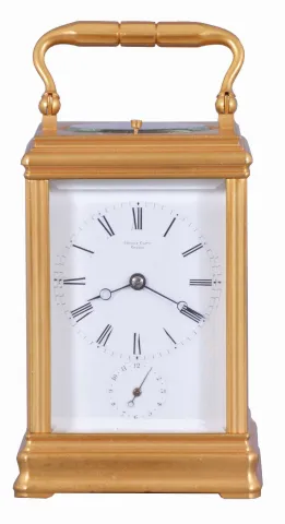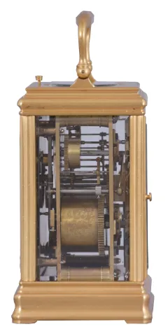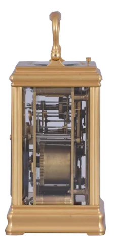 Drocourt, Paris, for Henry Capt, Geneva, a Cannelee cased hour repeating carriage clock, glazed, gilt case with molded top and base, signed Roman numeral white enamel dial, blued steel Breguet style hands, 8 day time, strike, and alarm movement with lever