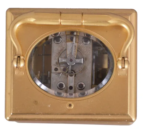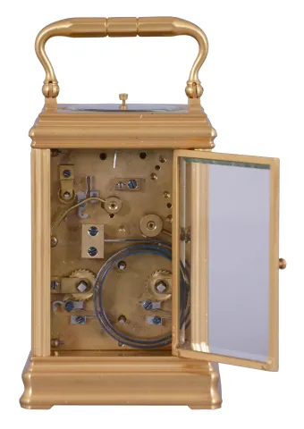 Drocourt, Paris, for Henry Capt, Geneva, a Cannelee cased hour repeating carriage clock, glazed, gilt case with molded top and base, signed Roman numeral white enamel dial, blued steel Breguet style hands, 8 day time, strike, and alarm movement with lever platform, repeating the last hour on demand, the back plate with Drocourt's mark, serial #10018 a bit dirty, gilding restored, right side glass with chip at lower right, left glass with chip at lower left, dial with minor scratches, movement with staining, gong with a few spots of oxide, running, striking, and repeating correctly, alarm not functional