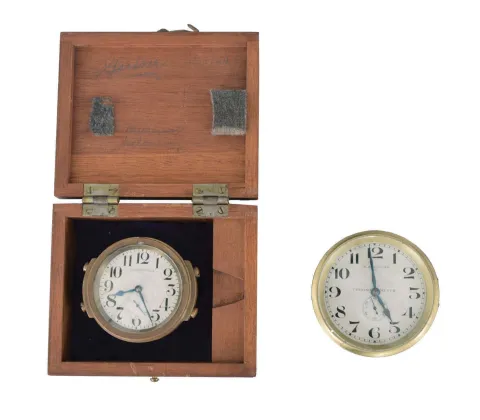 Two pocket chronometer movements, now in brass bowls for gimbal mounting, the first marked "Thos. Buchanan Dublin", 14 jewel fusee movement with Earnshaw spring detent escapement, Z balance with compensation limiting device and helical balance spring, silvered Arabic numeral dial, blued steel hands, serial #1581, the other marked "E. Perregaux", 20 jewel nickel bar movement with pivoted detent escapement, and cut bimetallic balance with gold timing screws, Arabic numeral silvered dial, blued steel hands, serial #7098 both running