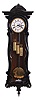 those who know Austrian item will recognize the very top trim as the carved top from a night stand, now blackened to match the case. It does not look "bad" but something "delicate" would be more appropriate. Bottom finial is a replacement. The case finish is original, but there are some dry chips and losses to the rinish here and there. The rosewood grained backboard is fine. Beat scale at bottom has chips. Has a well made movement, good dial and matched set of hands. Nice matched pulleys with uncomon petal shaped spokes.