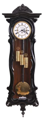 Austria, "Vienna" regulator, 3-weight, grand sonnerie, in an ebonized serpentine case, the white porcelain dial signed Aug. Belisko in Prag, and with embossed pattern brass bezel, and slide mount movement. those who know Austrian item will recognize the very top trim as the carved top from a night stand, now blackened to match the case. It does not look "bad" but something "delicate" would be more appropriate. Bottom finial is a replacement. The case finish is original, but there are some dry chips and losses to the rinish here and there. The rosewood grained backboard is fine. Beat scale at bottom has chips. Has a well made movement, good dial and matched set of hands. Nice matched pulleys with uncomon petal shaped spokes.