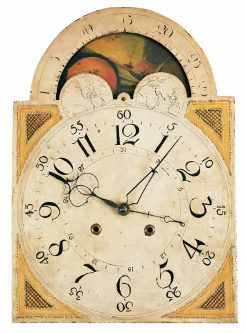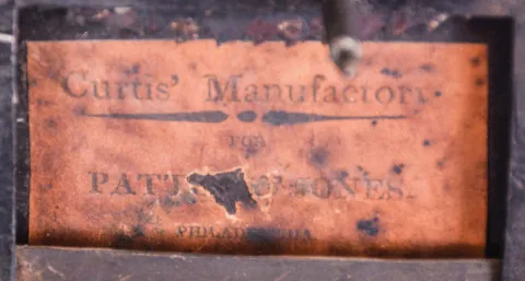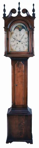 Pennsylvania, tall case clock, 30 hour, time and bell strike, single weight driven movement in a walnut case with broken arch top, three wooden flame finials, four turned columns at bonnet corners, over cove molded trunk with shaped door top, and crotch walnut base resting on ogee bracket feet. The painted metal dial retains its originalpaper label, "CURTIS' MANUFACTORY FOR PATTON & JONES, PHILADELPHIA" and has calendar hand off center arbor, moon phase with interesting burning ship scene. the case has been refinished and the feet have been shortened. The black numerals on the painted metal dial have been strengthened The bell and bell stand need to be reattached. This is otherwise a very nice example with a very rare Curtis label on dial, original wooden pulley and great original flame finials.