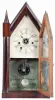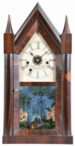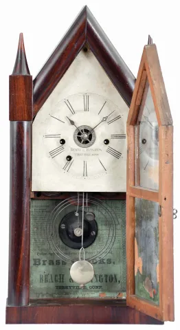 Beach and Byington, Terryville, Conn., steeple clock with a double fusee 30 hour time, strike and alarm movement in a rosewood veneered case. The rosewood case has an old finish. The original painted dial, in excellent condition, is signed "Beach & Byington, Terryville, Conn". The hour hand is original and the minute hand a replacement. The top door glass is original as is the painted tablet in the bottom of the door. Note the separate wheel on the fusee board for the alarm mechanism. The two finials have loss to their tops. The case interior has a beautiful green Beach & Byington label. This is a scarce clock and the first one we have offered for auction.