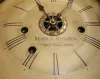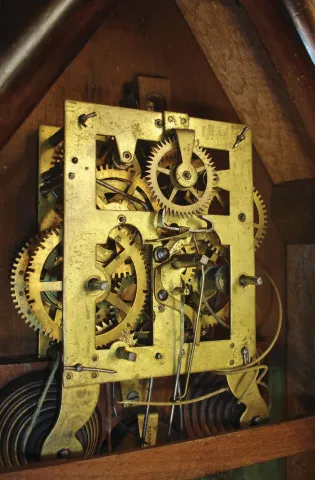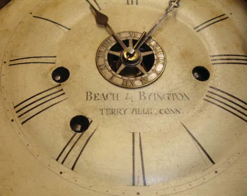 The rosewood case has an old finish. The original painted dial, in excellent condition, is signed "Beach & Byington, Terryville, Conn". The hour hand is original and the minute hand a replacement. The top door glass is original as is the painted tablet in the bottom of the door. Note the separate wheel on the fusee board for the alarm mechanism. The two finials have loss to their tops. The case interior has a beautiful green Beach & Byington label. This is a scarce clock and the first one we have offered for auction.