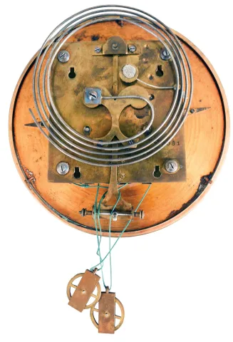 (1) small splits around the edge of the door. Hairline cracks in the dial. Bottoms of weights need to be glued; (2) Hairline cracks in dial. Small dents in weights. Dimensions are for 3-weight clock. Sold "as is".