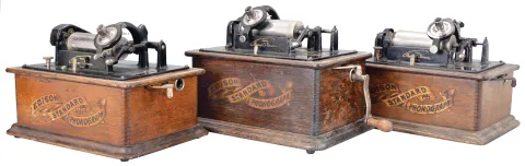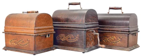 Phonographs- 3 (Three) Thomas A. Edison, Orange, NJ, "Standard" model spring driven cylinder phonographs in oak veneer cases including approximately 100 cylinder records. all three oak cases have old finishes and original domed lids with case decals. The finish on one lid is darker than the base. All have reproducers. Only one machine has a winding crank. Sold "as is".