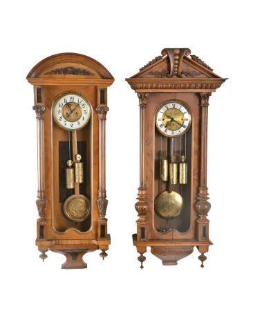 Clocks- 2 (Two) Vienna Regulators, engraved brass weights and pendulum, in carved walnut cases: (1) two weight, time and strike; (2) three weight, grand sonnerie