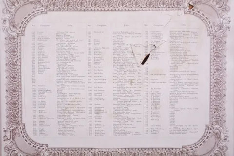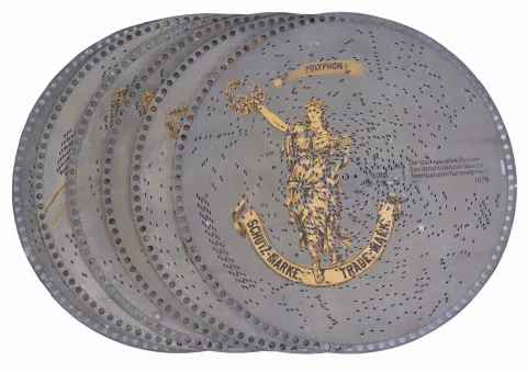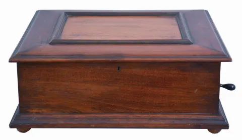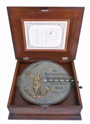 Germany, Polyphon Musikwerk, 39.8cm or 15 1/2 inch disc playing music box, style 43 variant [single comb with going barrel movement [not a coil spring], in a nicely figured mahogany case, plain, with raised molding to lid, and an insert inside lid showing available tunes. With 7 Polyphon discs, including the Star Spangled Banner (Das sternfunkelnde Banner) Note this box will play Regina 15 1/2 inch discs also, see separate lot of 125 Regina discs. Minor nicks commensurate with the age of the item.