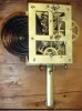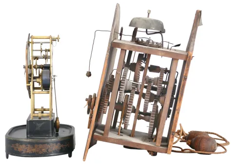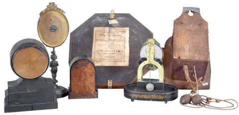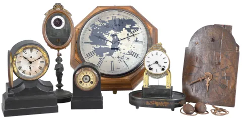 Clocks- 6 (Six) American and European: (1) Terry Clock Co.,15 day skeleton timepiece with broken dome; (2) Smallest Terry Clock Co.,iron cased alarm; (3) S. B. Terry (Terry Clock Co) Marine lever; (4) c1850 German wooden works dial clock with CROWN WHEEL, cows tail; (5) Seth Thomas ebonized case alarm and (6) French boudoir mirror timepiece [rear wind watch movement] in order, Terry skeleton is nice, complete and sound with good dial, but needs dome, Small iron alarm is missing rear label, otherwise complete and running. The dial of the Marine Lever is flaking and will need repainting, however this is a 2 ball TORSION movement, uncommon, movement with pat date of Oct 5, 1852. The German dial clock is missing a piece of the dial, lower left, no weights, no pendulum disc, and the dial is distressed...rare. The Seth Thomas alarm is unknown and the boudoir clock lacks hands and is not running, still unique. All sold as-is