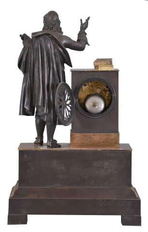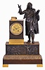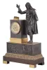 French. bronze & ormolu figural clock, depicting a French Barrister with his law books atop pedestal, and reading scrolls held in his left hand. The well made bell strike movement, with silk thread suspension, with bezel and glazed door intact over dial,