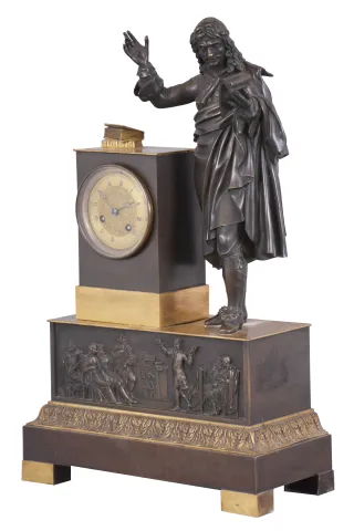 French. bronze & ormolu figural clock, depicting a French Barrister with his law books atop pedestal, and reading scrolls held in his left hand. The well made bell strike movement, with silk thread suspension, with bezel and glazed door intact over dial, the brass dial center embossed, and the silvered chapter ring with painted Roman Numerals. there is loss to gilding on corners and high spots, especially on the waist molding of acanthus leaves. Detail on the figure is exceptional. Movement is complete; would benefit from cleaning. Breguet style moon hands.