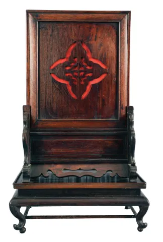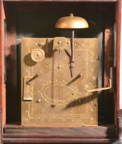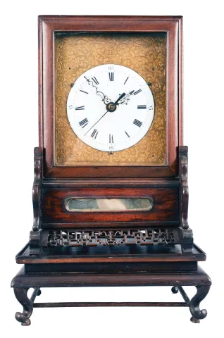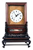 China, bracket clock reproduction, 8 day, time and strike, double fusee with crown verge escapement center seconds in a rosewood case sitting on fretwork base, white enamel dial mounted on cast brass front plate, 20th century. hairline cracks in enamel dial. Case is in good condition with interesting wax seal on top. Modern glass used throughout. Brass cables on fusees. Heavy brass movement will need to be reinstalled into the case. One of the movement mounting brackets is broken. Pendulum bob is from a modern German clock. Aluminum seconds hand. Movement ticks and strikes, but was not tested comprehensively.