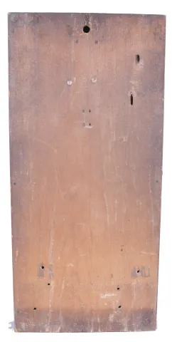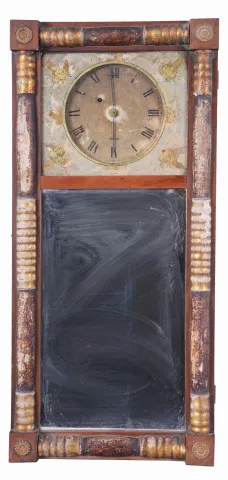 Hitchcock mirror frame has wear and loss to the half-round columns. The lower left applied metal button on the corner block has been replaced. Original painted dial is heavily soiled. Original hands and pendulum. Original tablet has been overpainted on the back with gold paint in an attempt to repair background loss. Mirror is a replacement. Replaced weight is a lead filled metal container.