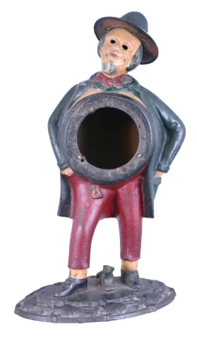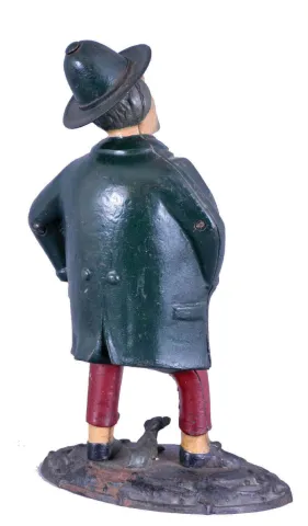 American, attributed to Bradley & Hubbard, CASE ONLY for an exceedingly rare blinking eye clock: "MAN IN TRENCH COAT WITH DOG" paint appears to be original with significant wear. Zoom in to see chips on face and crazing to finish. Neither Chris nor I have seen this case before, and despite being only a case, is sure to appeal to the serious collector willing to transfer / sacrifice the movement and eyes from a more common model.