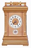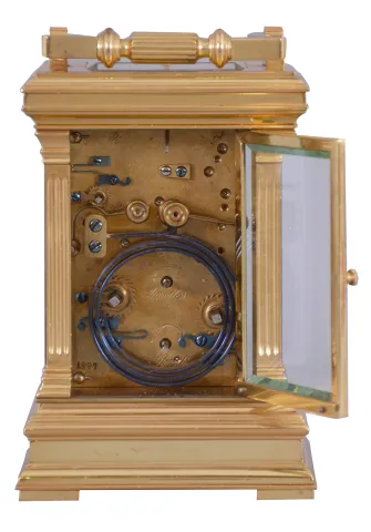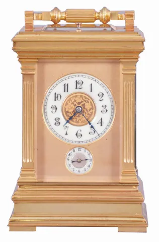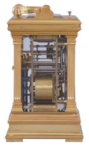 France, a large, Anglaise cased carriage clock with grand sonnerie striking, the glazed, gilt case with molded top and base, the corners with fluted pilasters, Arabic numeral white enamel dial with gilt center and mask, blued steel distaff hands, 8 day time, strike, and alarm movement with lever platform, sounding grand or petit quarters in passing, and repeating the last hour and quarter on demand case polished and lacquered, glasses good, mask with a few small spots and minor discoloration, dial and hands very good, movement with minor staining, gongs with oxidation, running, striking, and repeating, strikes grand sonnerie at first quarter when set to petit, alarm not functional