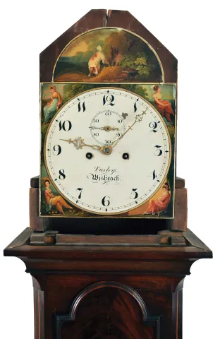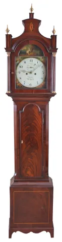 Thomas Vurleyl, Wisbeack, England, tall case clock, 8 day, time and bell strike, weight driven movement, c. 1840, in a c. 1780 string inlaid mahogany case with pagoda top, brass finials, crotch mahogany trunk door, fluted columns flanking hood. the case retains an old finish. The finials and feet are replacements. The movement, which needs to be restrung, is approximately 60 years later than the case. The painted metal dial has "W&H" signature on back.
