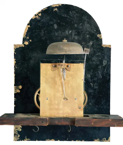 the case retains an old finish. The finials and feet are replacements. The movement, which needs to be restrung, is approximately 60 years later than the case. The painted metal dial has "W&H" signature on back.