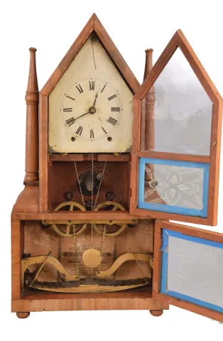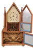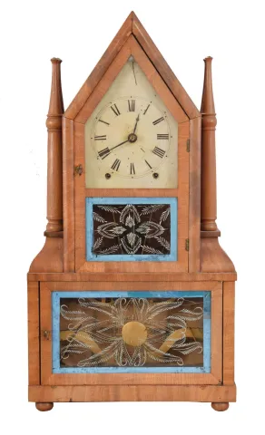 Birge & Fuller, Bristol, Conn. Steeple on Frame with Candle Finials shelf clock with an wagon spring driven, 8 day, time and strike movement.