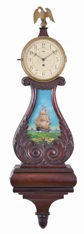 Chelsea Clock Co., Boston, Mass., early 20th Century, limited production "Lyre Banjo" with quality Chelsea lever movement. With original tablet depicting the "Daniel Webster" a new packet ship. there are minor nicks and scrapes commensurate with the age of the piece. This is an uncommon model, sure to appeal to Chelsea collectors. Movement is sound, but requires cleaning; note minute hand retainer screw is missing [a standard Chelsea item]. Retains original dial, hands, eagle, finish, tablet, etc. Original silvered dial has some extra holes to hold it to the case, but is original to the case.