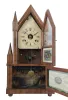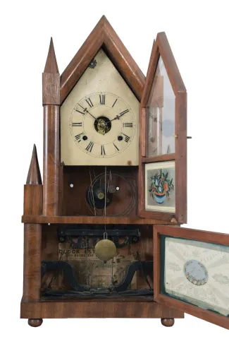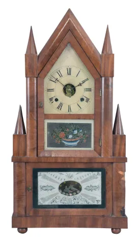 Birge & Fuller, Bristol, Conn., (sold by J. J. & W. Beals, Boston) steeple on frame shelf clock with a wagon spring driven 30 hour time and strike movement in a mahogany veneered case. The case has been refinishewd and has some veneer loss on the lower right front molding. The original painted dial has minor loss at the winding holes and the mounting points. The hands are period, but probably not original. The upper door glasses are original with the lower glass displaying a beautiful colored vase framed by a white border. The lower door tablet is in excellent original condition. Two of the finials show very minor loss at the top. The wagon springs chains have been replaced by wire. The case has an interior Birge and Fuller label with an overpasted label from J. J. & W. Beals in Boston. .
