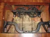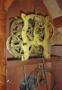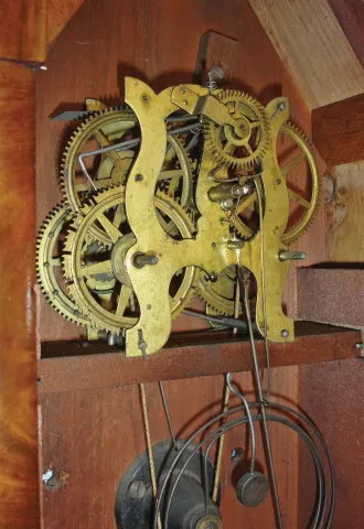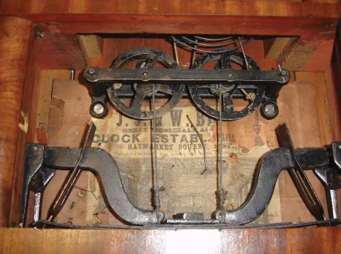 The case has been refinishewd and has some veneer loss on the lower right front molding. The original painted dial has minor loss at the winding holes and the mounting points. The hands are period, but probably not original. The upper door glasses are original with the lower glass displaying a beautiful colored vase framed by a white border. The lower door tablet is in excellent original condition. Two of the finials show very minor loss at the top. The wagon springs chains have been replaced by wire. The case has an interior Birge and Fuller label with an overpasted label from J. J. & W. Beals in Boston. .