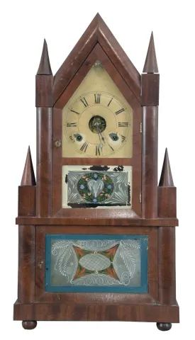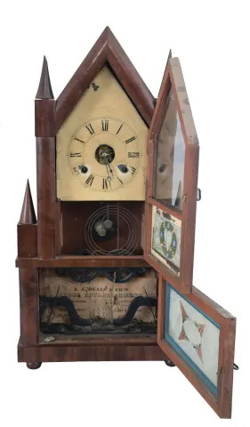 Birge & Fuller, Bristol, Conn., (sold by J. J. Beals, Boston) steeple on frame shelf clock with a wagon spring driven 30 hour time and strike movement in a mahogany veneered case. The case retains some original finish. There is very minor veneer loss/repair. The original painted dial, labelled "J. J. Beals, Boston" shows paint loss at the winding holes. The hands are old, but mismatched and not original to this clock. The strike side wagon spring chain is missing. The upper door glasses are both original. with the lower glass design mostly intact but with some loss to the white border. The lower door glass is original with a beautuful colored design inside a green border and is in excellent condition. The case has an interior Birge and Fuller label with an overpasted label of retailer J. J. Beals in Boston.