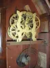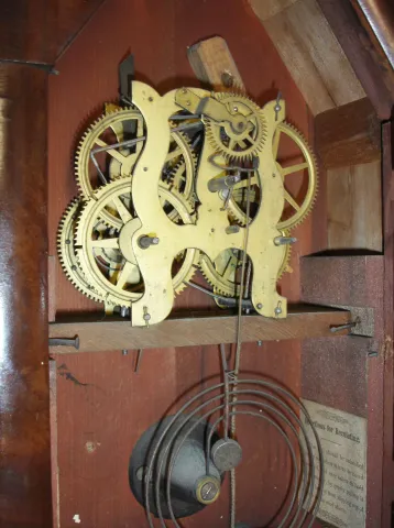 The case retains some original finish. There is very minor veneer loss/repair. The original painted dial, labelled "J. J. Beals, Boston" shows paint loss at the winding holes. The hands are old, but mismatched and not original to this clock. The strike side wagon spring chain is missing. The upper door glasses are both original. with the lower glass design mostly intact but with some loss to the white border. The lower door glass is original with a beautuful colored design inside a green border and is in excellent condition. The case has an interior Birge and Fuller label with an overpasted label of retailer J. J. Beals in Boston.