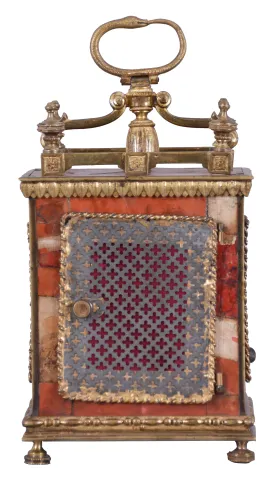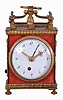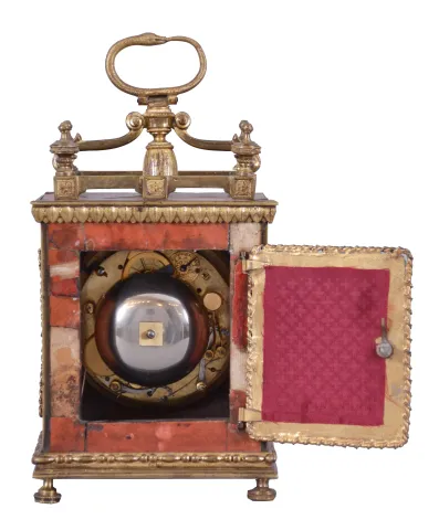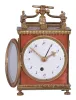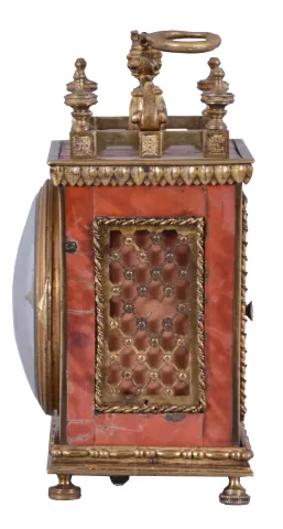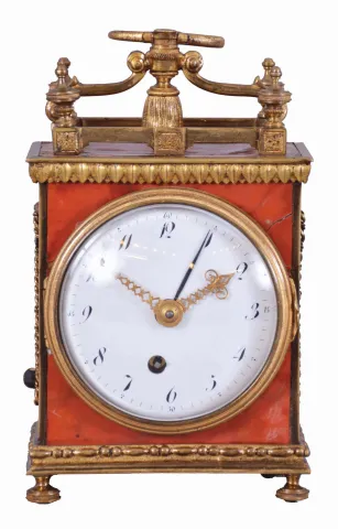 Switzerland, a Pendule d'Officer style travel clock, the dovetailed wooden case with underpainted horn veneer, gilt brass gallery with turned finials, cyma curved arms supporting a molded tassel below an Ouroboros form handle, gilt waterleaf cornice, gilt beaded and molded base on turned feet, and gilt rope molding framing lattice panels on sides and back, gilt bezel with convex glass, Arabic numeral white enamel dial, original pierced and engraved gilt hands, movement of two to three day duration, with Sully variant two plane escapement, with time, grand sonnerie strike on demand, and alarm functions, the strike and alarm trains wound by cords veneer with splits, losses to veneer on case back, gilding with losses, glass with minor scratches, dial with small chip at winding arbor, hands very good, right side fret with minor loss, rear fret replaced, right rear foot replaced, running and striking correctly, alarm functional.