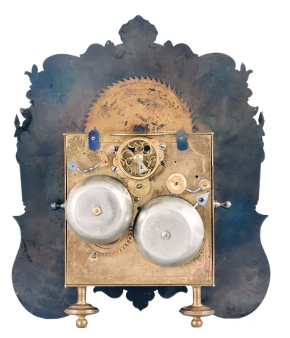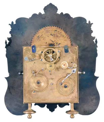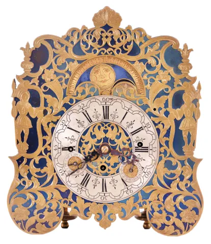 Austria, a small, complicated, grand sonnerie striking shelf or table clock, the blued steel dial plate with overlaid fretted, foliate engraved mask, Roman numeral, arcaded, engraved silvered dial with subsidiary day and date displays, and with engraved moon phase dial over 12:00, blued steel hands, 30- 60 hour grand sonnerie striking movement with verge escapement, time train with fusee and strike springs contained in fixed barrels, the balance with single turn spring, oscillating beneath a pierced, decorated bridge on the back plate dial with restorations and replacements, one dial foot missing, minute hand repaired, movement oily, not running or striking, needs service