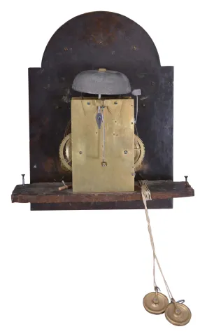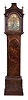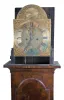 the case has an old finish and the base is an older replacement. There is a chip out of the molding on top of trunk door and a 3" triangular piece molding absent on right return molding below hood. The finials are replacements. The weights and pendulum are period. The movement appears recently serviced.