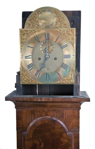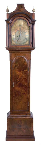 George Maynard, Melford, England, 8 day, time and strike, weight driven movement in a very handsome pagoda top burled walnut case, tombstone trunk door with cove molding. molded base, two full columns flanking hood door and spun brass finials. The brass dial has applied spandrels, maker's signature in boss surrounded by applied brass elements and calendar aperture at 6. the case has an old finish and the base is an older replacement. There is a chip out of the molding on top of trunk door and a 3" triangular piece molding absent on right return molding below hood. The finials are replacements. The weights and pendulum are period. The movement appears recently serviced.