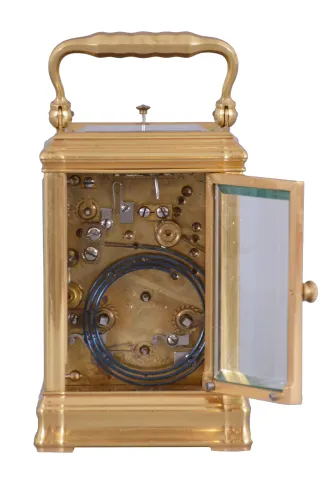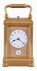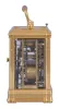 Margaine, Paris, a 3/4 size, Gorge cased hour repeating carriage clock with original outer box, gilt case with beveled glasses, Arabic numeral white enamel dial with gilt, engine turned mask, blued steel hands, 8 day time, strike and alarm movement with